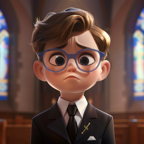 A boy, style of Pixar, in a baptismal suit with short light brown hair, a little bit of freckles, and dark blue eyes and rectangular blue glasses