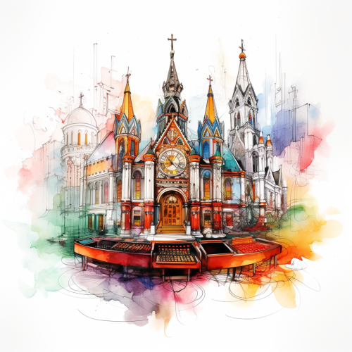 a colorful sketch of an architerctural rendering of a very large blank screen inside a tiny church