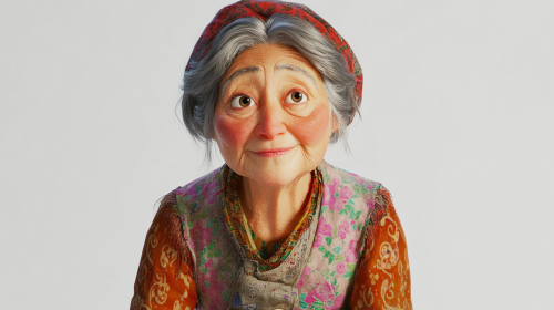 3D animation in Disney style; full-length portrait of a Kazakh grandmother about 60-70 years old on a white background in the studio, a caring face, with fine wrinkles around the eyes and mouth, the eyes are framed by silver strands of hair, which are tied at the back under a light traditional Kazakh scarf, She is dressed in a comfortable blouse with a floral pattern and a long soft colored skirt. On your feet are practical but stylish shoes, On your hand is a small fabric bag, full length, high contrast lighting, bright and cheerful atmosphere, --ar 16:9 --v 6.1