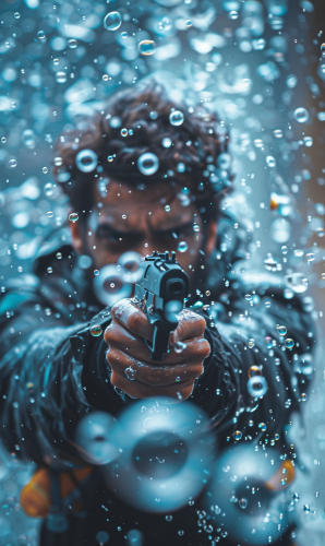 an action packed image of a super masculine assassin engaging in battle, pointing a gun at the camera, the gun is shooting out bubbles towards the camera, intense bubble warzone, high octane action, bubble guns --s 200 --ar 4:3