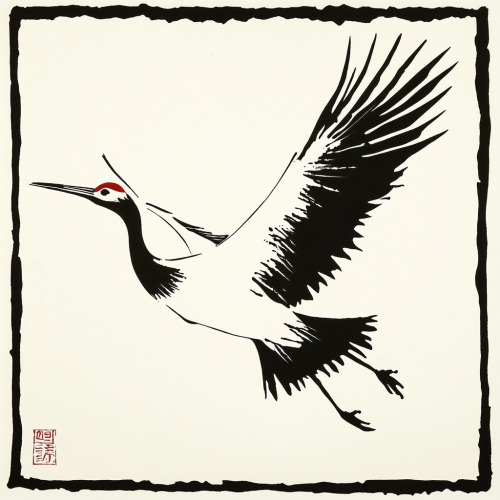 japanese crane bird woodcut print, a simple graphic design with black ink on a white background, no shadowing or texture. The illustration is in the style of Chinese folk art, featuring an elegant, cartoonish character. It includes a square border that adds depth to the composition. There's a playful expression on its face as it jumps or flies through space, adding movement and energy to the artwork