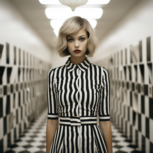 a captivating full-body black and white portrait in a minimalistic room with checkerboard patterns on all walls, ceilings, and floors. The subject is a short-haired blonde model dressed in stylish black and white patterned clothing, standing gracefully within the space. Simulate the look of Ilford 400 black and white film to achieve a distinct texture and film grain. Apply high key lighting to illuminate the scene, ensuring that the checkerboard patterns on all surfaces are clearly visible while capturing the full-body composition of the model against the minimalist checkerboard background. Utilize a wide-angle lens, such as 35mm f/1.8, to achieve the desired composition, depth of field, and lighting for this visually stunning and evocative portrait --s 750 --style raw