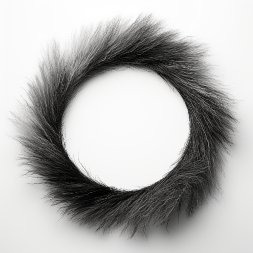 Hr create a circle within a cirle with a black and gray texture made out of nylon and alpaca thread on a white background. HR photography