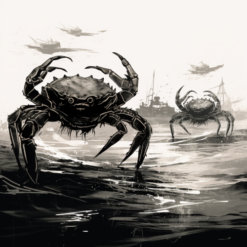 floating mystical crabs in perspective, stylized, comic style, black and white ink in toned gris paper, brush strokes, moviment strokes, asymmetry composition. graphic design style