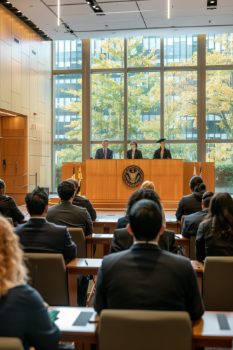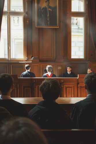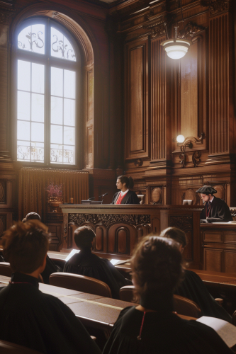 A modern courtroom filled with legal professionals, judges in robes, lawyers, and a prosecutor listening attentively to a young educator at the podium. The room is well-lit with natural light from large windows, the walls are decorated with clean wooden panels and legal insignia. Created Using: courtroom realism, natural lighting, cinematic composition, sharp focus, professional documentary style, legal atmosphere, high detail, traditional courtroom decor --ar 2:3 --v 6.0