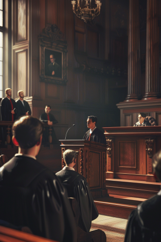 A modern French courtroom with dark wooden furniture, a young educator stands at a podium practicing their speech. In the background, judges in black robes with red sashes, lawyers in traditional black robes, and a prosecutor listen attentively. The courtroom is lit by natural light from large windows, creating a solemn atmosphere. Created Using: realistic courtroom design, natural lighting, French legal tradition, professional photography, sharp focus, cinematic framing, rich textures, muted tones --ar 2:3 --v 6.0