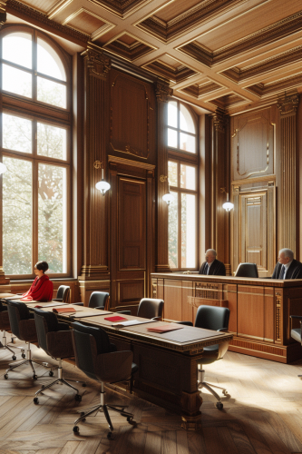 A French courtroom setting with a young speaker at a wooden lectern, judges in black robes with red sashes sit at the elevated bench, lawyers in black robes are seated nearby. The room features wooden paneling, large French windows, and traditional legal decor. Lighting is soft and formal. Created Using: documentary style, realistic textures, cinematic lighting, French legal setting, muted color palette, professional atmosphere, high detail --ar 2:3 --v 6.0