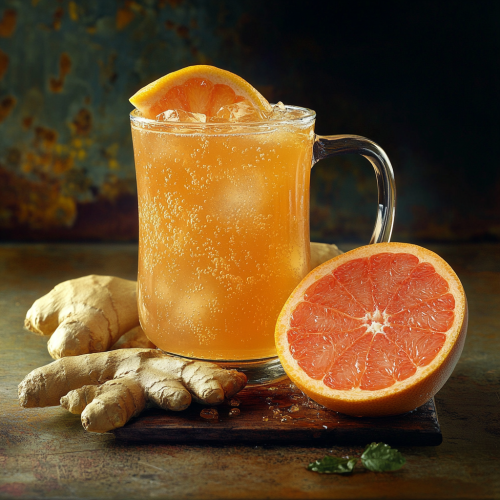 Professional photographer documentary of a Grapefruit tea , ginger , gogi berrywith honey in a 16 oz glass stange hyper Realistic 16k, hyper quality, Photorealism, Food photography Food, hyper --v 6.1