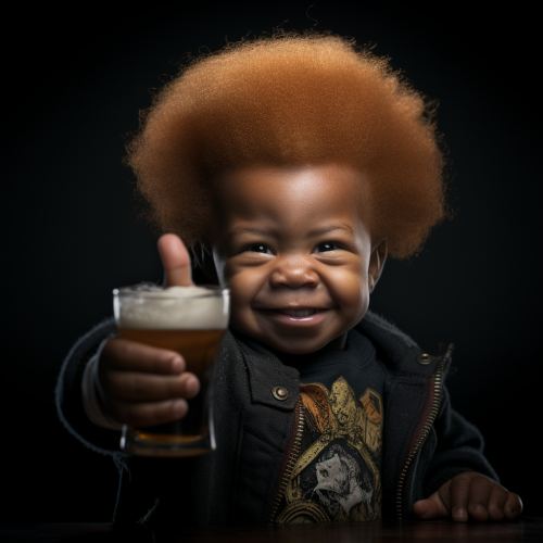 an high resolution and synthetic photography of an african dwarf with ginger hairs and a ginger beard making the middle finger sign. Drunk. Beers. Black is beautiful. Little African dwarf. On foot.