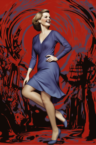 beautiful ginger hair woman walking by Enoch Bolles, full pose, confident look, lively action pose, open lips, smiling, v-neck lace dress, blue and red colors, cadillac in the background, american prints 1950 --no text, letters --ar 2:3 --s 750