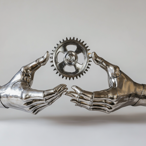Two silver-colored hands, open and facing each other, with a large, floating silver gear between them, statue model, with the hands and one gear made of metal, giving the image a mechanical and artistic feel, as if the gear is being presented or controlled by the hands.