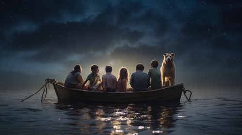 film still, a family with an old dog in a dingy in an endless ocean, wild weather, stars, an eclipse, in the style of life of pi, cinematic --ar 16:9