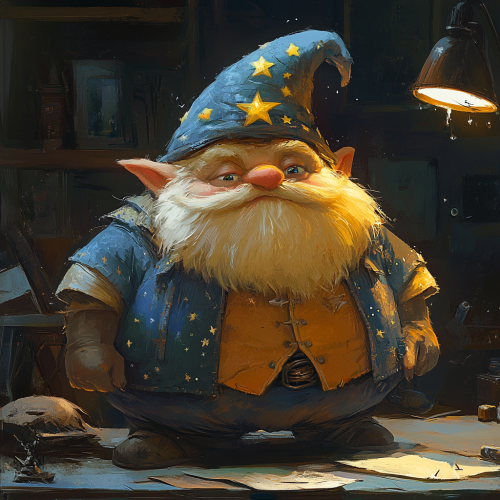 fat gnome halfling with innocent face looking serious wearing bright clothes and a hat with stars and moons on it, standing in front of a cluttered desk, dungeons and dragons style
