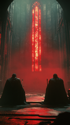 1980s dark fantasy, Elden ring still image of 2 kings sitting on thrones of swords, the setting is inside of a dark castle with light shining through a red stained glass window. ar 9:16 --s 250 --v 6.1
