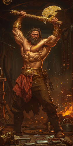Fantasy Digital illustration of the God Hephaestus working at his forge, the mythological Greek God of Blacksmiths, muscular male immortal, hold a double-headed hammer above his head, wears a gold belt shaped like a gold dragon head, gruff demeanour, immortal workshop background, dramatic pose, dynamic lighting, epic composition, high detail --ar 1:2 --v 6.0