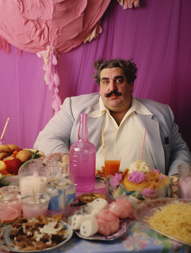 photo of a fat greek man with a moustache eating at a table with ouzo and greek food and there is a huge gyros meat behind him, he has beautiful almond shaped purple eyes with hazel speckles with bold eye make up, in the style of slim aarons, 1950s photo, pink balenciaga, retro - futuristic, in the style of kitsch aesthetic, spectacular backdrops, washington color school, light white, blue, black and pink, award winning, voluminous forms, mommy's on - the - phonecore, glittery and shiny, clear facial features, catcore, Kodak, M 35mm f/ 2 ASPH Lens, Portra 400 Film, stylish, dramatic photo, terry o neil, slim aarons, fashion photo, ellen von unwerth --ar 3:4 --v 5.2