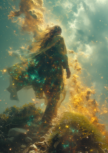 An astral Divine Pellucid god or godess image with USB drive, Epic competition, a divinities styles, and a Panoramic view --v 6.0 --c 15 --ar 5:7 --s 750