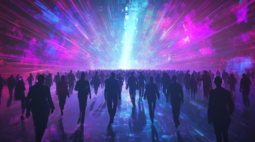 An image that shows a large crowd of people walking toward a bright, illuminated horizon, giving the impression of movement toward a digital or futuristic world. The figures are stylized and lack facial details, emphasizing their collective journey rather than individuality. The background and sides of the pathway are filled with neon streaks in shades of blue, purple, and pink, creating a tunnel-like effect that gives the scene depth and a sense of motion. Geometric shapes and lines on the sides enhance the high-tech, cyberpunk atmosphere, suggesting themes of connectivity, progress, and unity in a digital age. --ar 16:9 --v 6.1