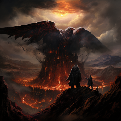 In the dark and treacherous land of Mordor, with Mount Doom looming in the distance, Frodo, weary and burdened by the One Ring, stands at the precipice of despair. The forces of darkness close in, and hope seems to wane. Suddenly, the majestic Eagles of Middle-earth descend from the sky, their wings outstretched and talons at the ready, coming to Frodo's rescue. Create an image that captures the breathtaking moment as the Eagles swoop down to save Frodo from the clutches of darkness, their presence bringing a glimmer of hope to his journey. hyper realistic, 8k