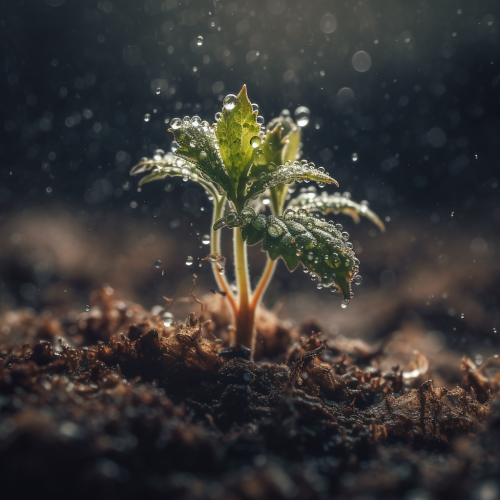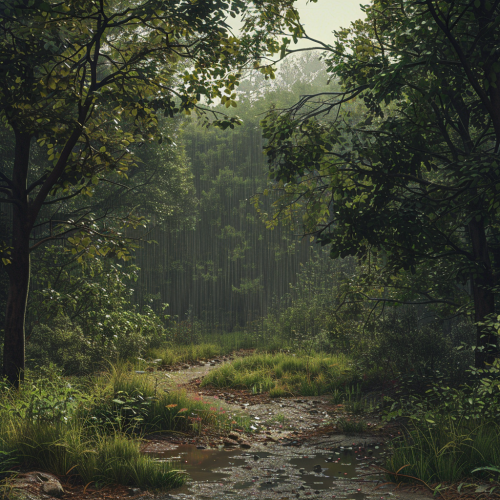 #103536 evening, rain, entrance to the forest, wet forest, impenetrable thickets, green trees and bushes, summer, realism, high detail, 4k --v 6.0 --ar 1:1