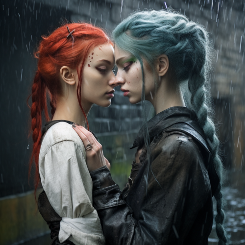 two characters, young little female goblin with green skin, green eyes, fine facial features, white hair in a ponytail, kissing her girlfriend's neck a female goblin redhead, with blue eyes, the two girls are very pretty, under the rain, against a wall