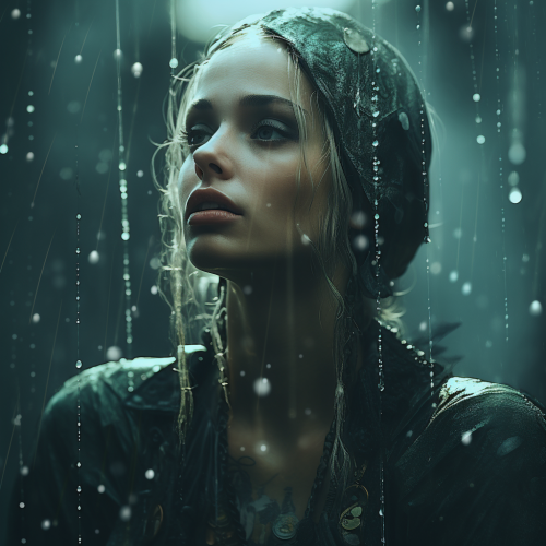 Create a moody, atmospheric scene of a woman holding an umbrella while walking in the rain. The background should be dark and blurred, with soft reflections of streetlights or city lights bouncing off the wet ground. The raindrops should be visible, adding texture to the scene, while the person’s silhouette, partially illuminated, conveys a sense of solitude and calm. The overall vibe should be cinematic, evoking feelings of introspection, with a play of light and shadow in a rainy, urban environment. burberry rain coat. hypereal photography