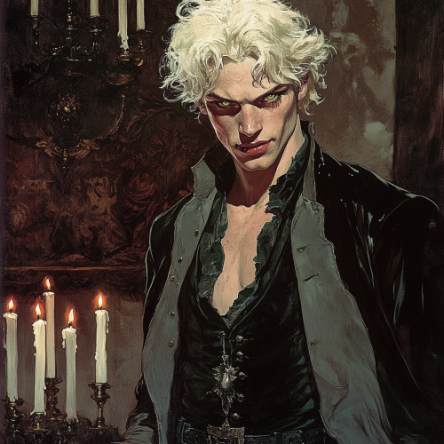 vintage dark fantasy illustration, style influenced by Frank Frazetta, Angus McBride, and other similar artists. A grim air of heady intrigue, ominous energies, and fell vapors. A sickly, rather sinister-looking young aristocratic man in his early twenties, with pale, lank blonde hair and green eyes ringed with dark shadowy circles. His pale skin and hollow cheekbones give him a gaunt look, dressed in a black silk doublet beneath a ratty grey cloak, belted at the waist. He stands before a table with numerous candles, eyes alight, looking feverishly into the flames.