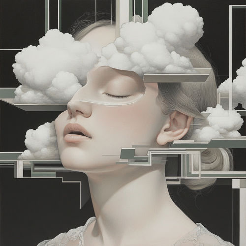 Surrealistic style, a woman's head is cut in half, with white clouds floating on the face and neck, obscuring her eyes and mouth, with simple shapes and lines, half-length portrait, iblack and green, the face is made up only of layered organic planes that appear to be floating above it, giving an illusionistic effect --sref 689229343 2534928772 3994927732