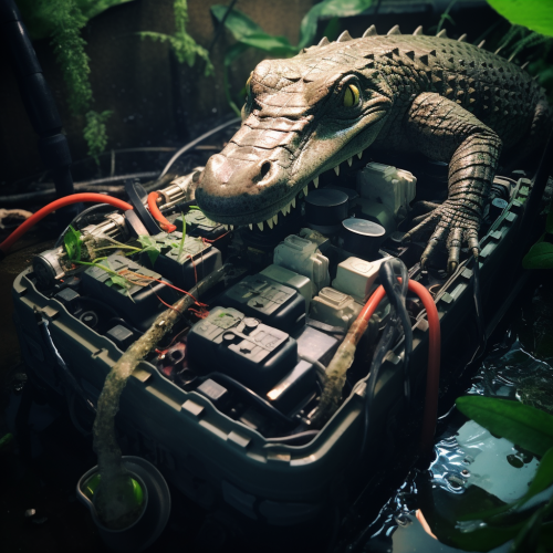 highly real photo with the background the battery which is connected to the crocodiles clips in the engine compartment of the new car