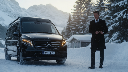 Photos of a driver dressed in black suit, white shirt, black tie, black coat waiting for a customer next to the latest generation black mercedes van class v, in the snow at courchevel in winter season, very realistic photos, 8k --ar 16:9
