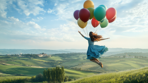 photorealistic. semi close up. of a woman flying through mid air because she is holding on to ballons with one hand. background is a green hilly landscape. --ar 16:9