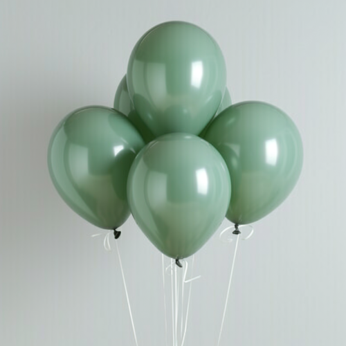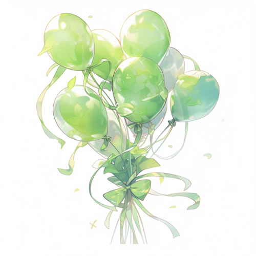 5 green balloons tied together, floating with intertwined ribbons, white background --s 750 --niji 5
