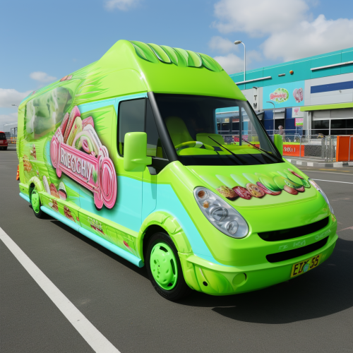 realistic photo of one modern green mercedes sprinter van driving through 1000 green balloons at sunrise, 35mm lens, canon 5R, depth of field, edgy design --ar 16:9 --s 250