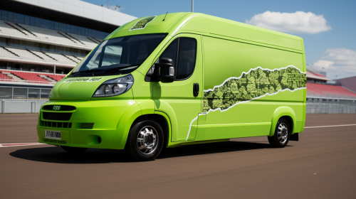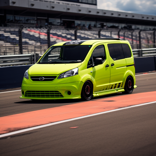 lime green van on a racetrack. The van has a big rear wing , fast tyres and a big engine coming out the bonnet