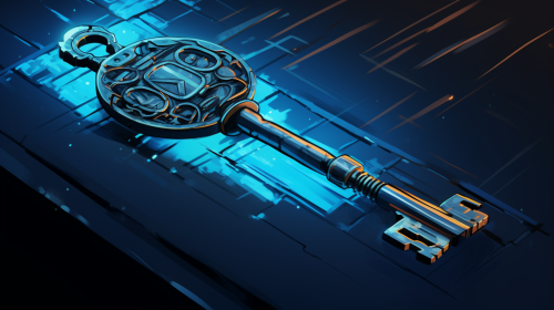 a blue mighty all powerfull fantasy glowing key made of steel going into a magical keyhole that holds the secrets of the universe, it's positioned vertically --ar 16:9