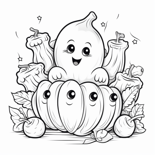 a cute cartoon ghost surrounded by bananas. Black and white Line drawing colouring book style.