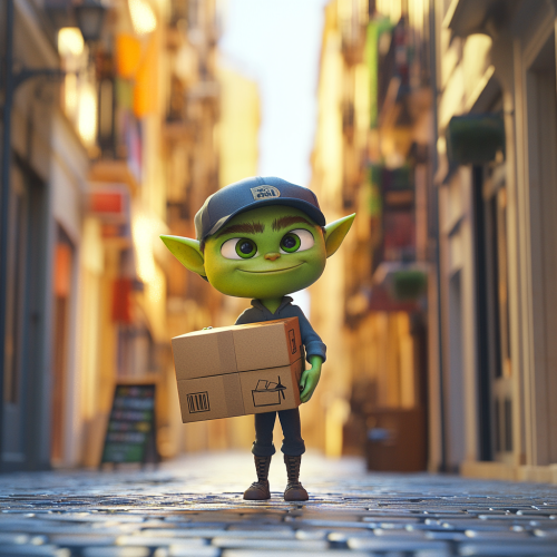 smart and happy green orc child with arms crossed dressed as a manager helping people on the street, pixar theme, 3d, render, 3d pixar, funny texture, beautiful colors, hue saturation, many colors, funny scene
