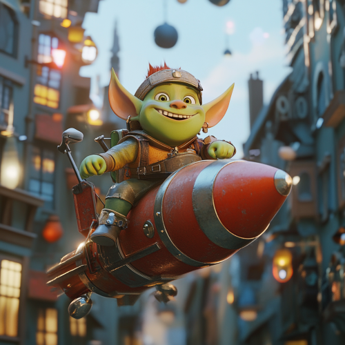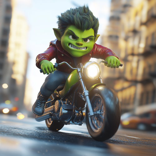 green orc child riding a rocket at high speed in the city, pixar theme, 3d, render, 3d pixar, funny texture, beautiful colors, hue saturation, many colors, funny scene, zoom in face