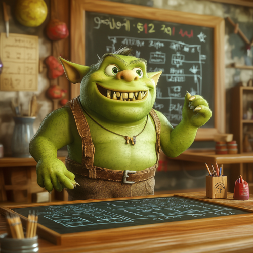 green orc child teaching mathematics, writing with chalk on blackboard, pixar theme, 3d, render, 3d pixar, funny texture, beautiful colors, hue saturation, many colors, funny scene, zoom face