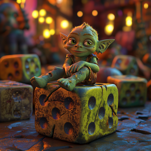 green orc child sitting on a large 6-sided dice, in an environment full of fun dice, pixar theme, 3d, render, 3d pixar, funny texture, beautiful colors, hue saturation, many colors, funny scene, zoom in on face