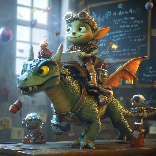 green orc child riding a dragon with fairies around and robots, writing with chalk on blackboard, pixar theme, 3d, render, 3d pixar, funny texture, beautiful colors, hue saturation, many colors, funny scene, zoom face