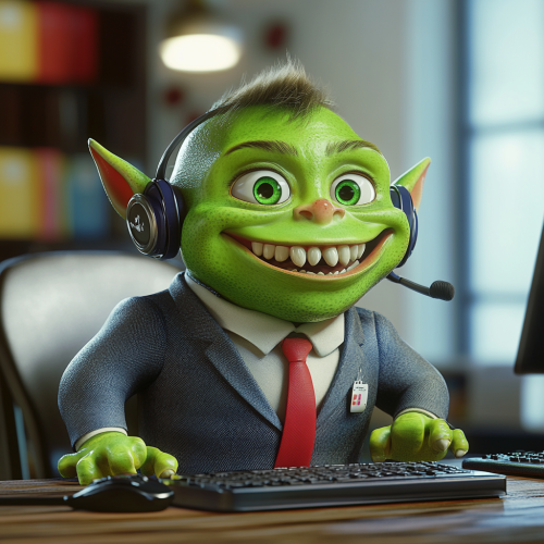 happy green orc young working in a call center, pixar theme, 3d, render, 3d pixar, funny texture, beautiful colors, hue saturation, many colors, funny scene, zoom face