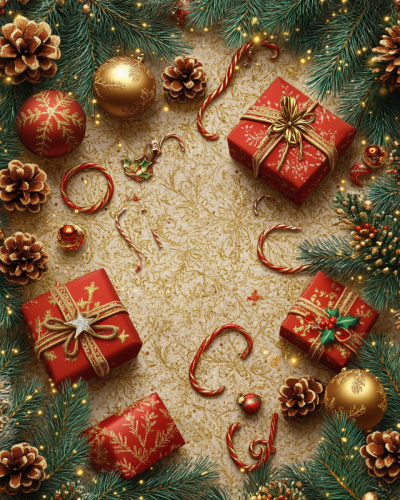 Christmas composition, top view, small pine branches, red Christmas baubles with gold ornaments, gold small stars, pine cones, gold gifts,red gift boxes, one gift is open with wedding ring with diamond, gold spiral ribbons, green ornaments in the gold background with ornamental pattern, a subtle snowfall pattern, calm winter atmosphere., detailed, realistic, --ar 4:5