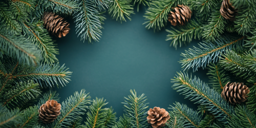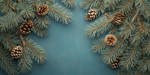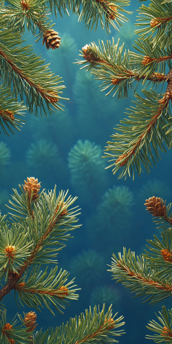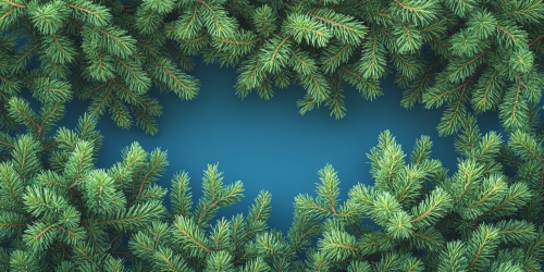 Photorealistic view of small pine tree branches arranged in a vignette style, surrounding the edges of the image with detailed needles, empty space in the center forming a circular shape, background color #336bb8, no pine cones --ar 2:1 --s 250 --style raw