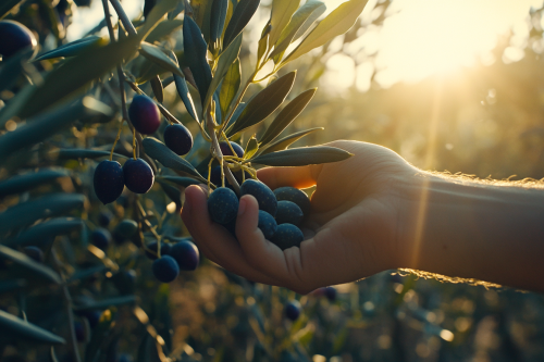 Close-Up of Olive Clusters Being Plucked Zoomed-in shot of dark green and purple olives being gently picked from branches. Sunlight filters through the leaves, creating a warm glow on the plump olives. --ar 3:2 --v 6.1