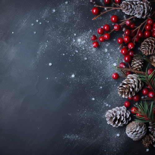 Dark background, Red berries, pine branches and cones, sequins and a minimum of snow for Christmas, plenty of space for text