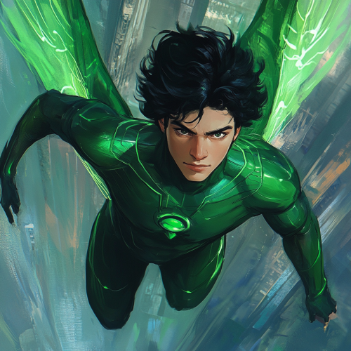an eighteen year old male superhero, dark hair and eyes, no mask or helmet, wearing a green super suit that makes him look like a green angel but with no wings, charismatic, flying