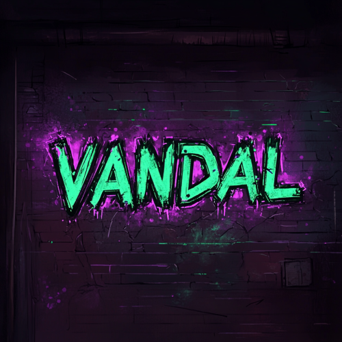 Design a Twitch emote featuring the word "VANDAL" in a bold, cyberpunk font. The text should have a gritty, rebellious look, with distressed textures and glowing accents in purple and green. The emote should be clear and impactful, even at a small size.
