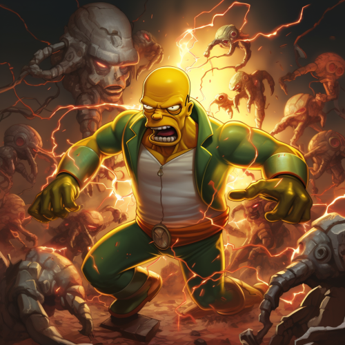 Comic illustration of Homer Simpson as a Marvel superhero, wearing a radioactive powered suit and battling villains like Mr. Burns with his signature lazy yet surprisingly effective fighting style --v 5.2