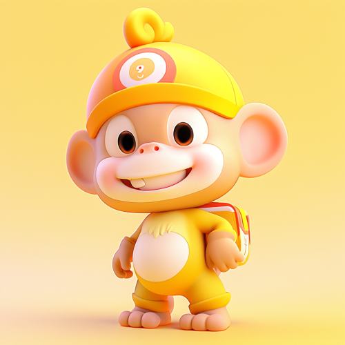 two images side by side,A cute yellow monkey wearing shorts, standing naturally and full-faced, Bubble Mart style, clean and simple design, IP image, high-grade natural color matching, bright and harmonious, cute and colorful, detailed character design, behance, Shanghai style, Organic sculpture, C4D style, 3D animation style character design, cartoon realism, fun character setting, ray tracing, children‘s book illustration style --niji 5